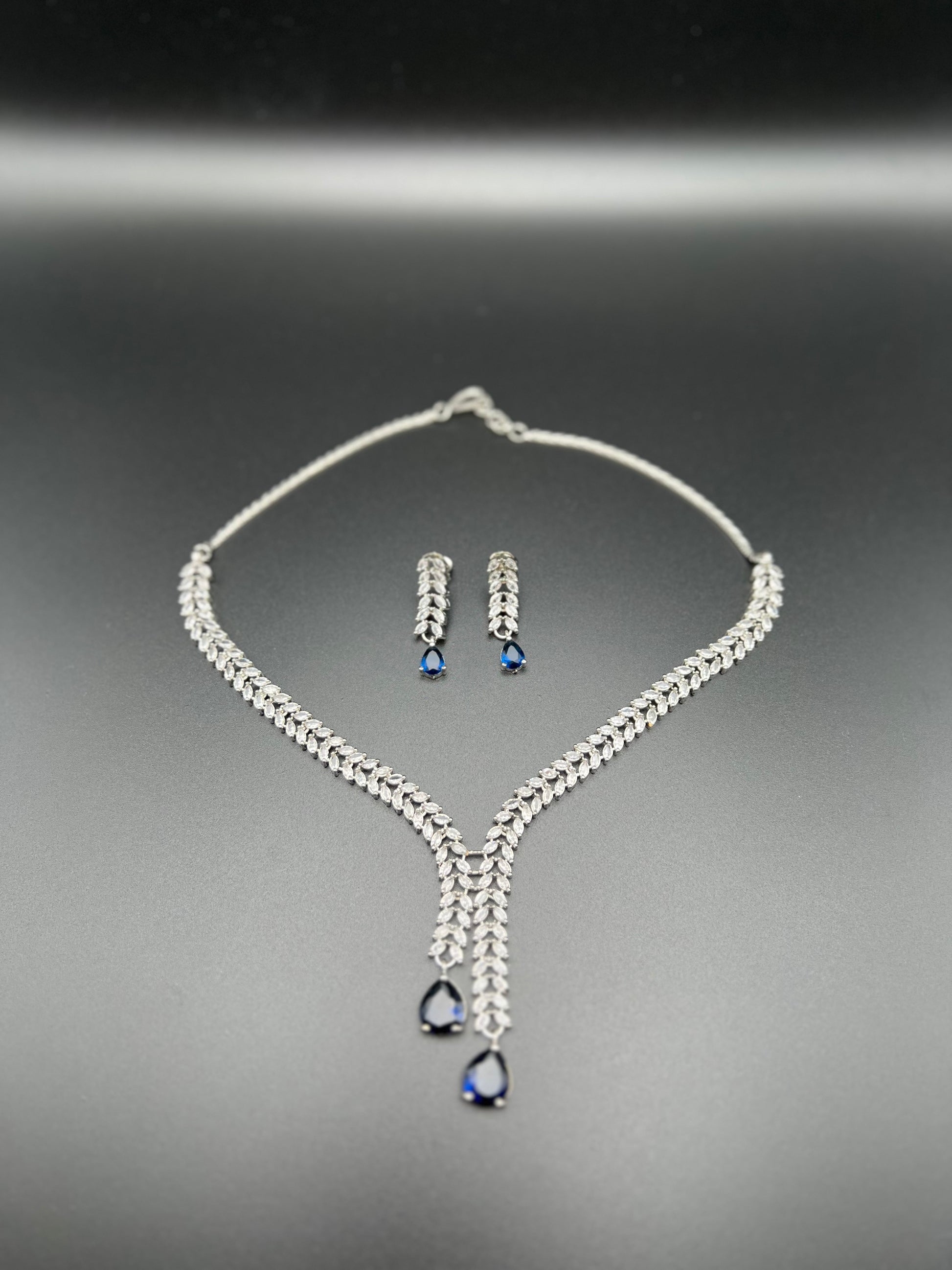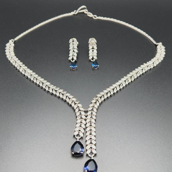 Sophisticated and timeless, this silver-toned jewellery set features a sleek, cascading design enhanced by deep blue teardrop crystals. The necklace showcases two graceful strands of leaf-shaped accents that draw the eye down to striking blue drops, creating an elegant Y-shaped silhouette. Matching earrings mirror the same refined detailing, completing a perfectly coordinated look.