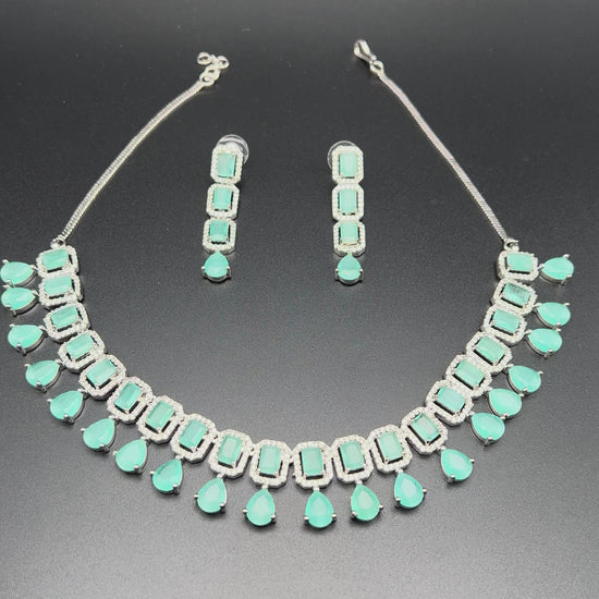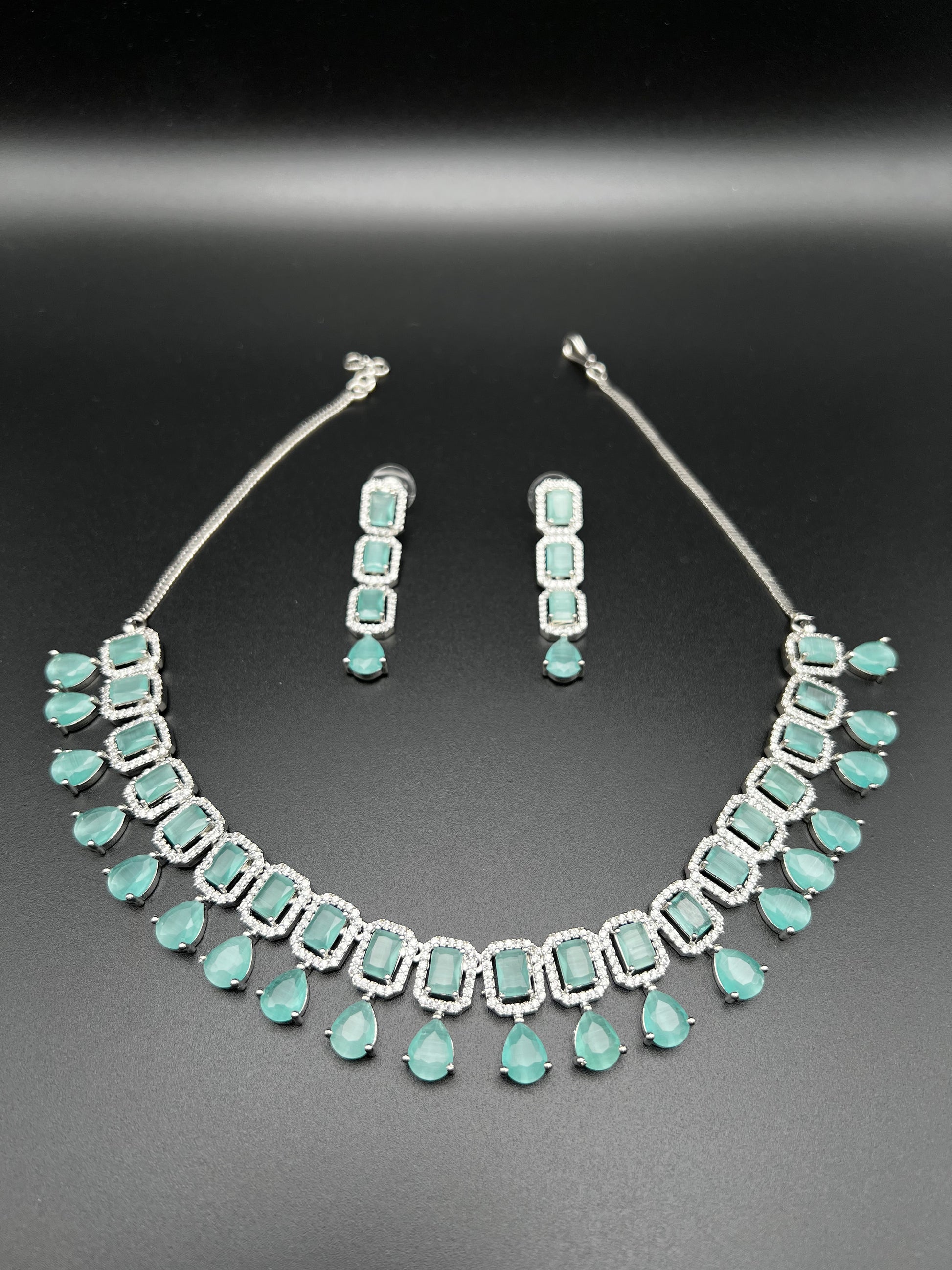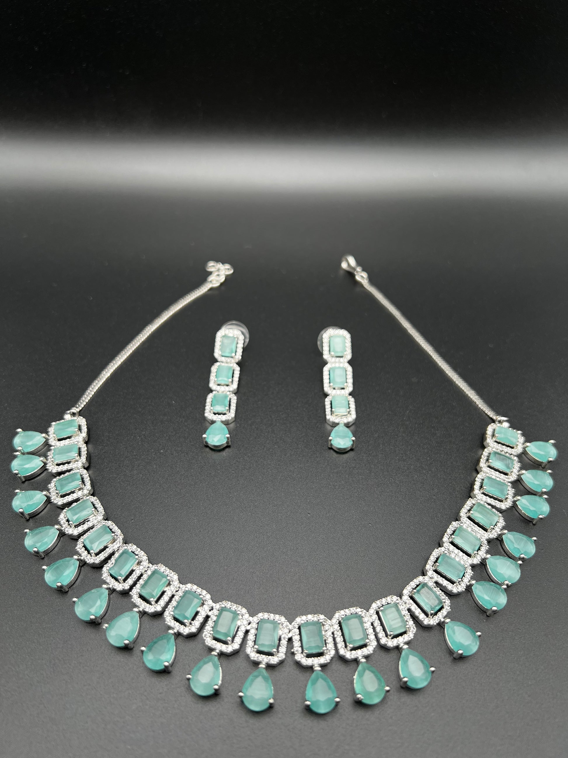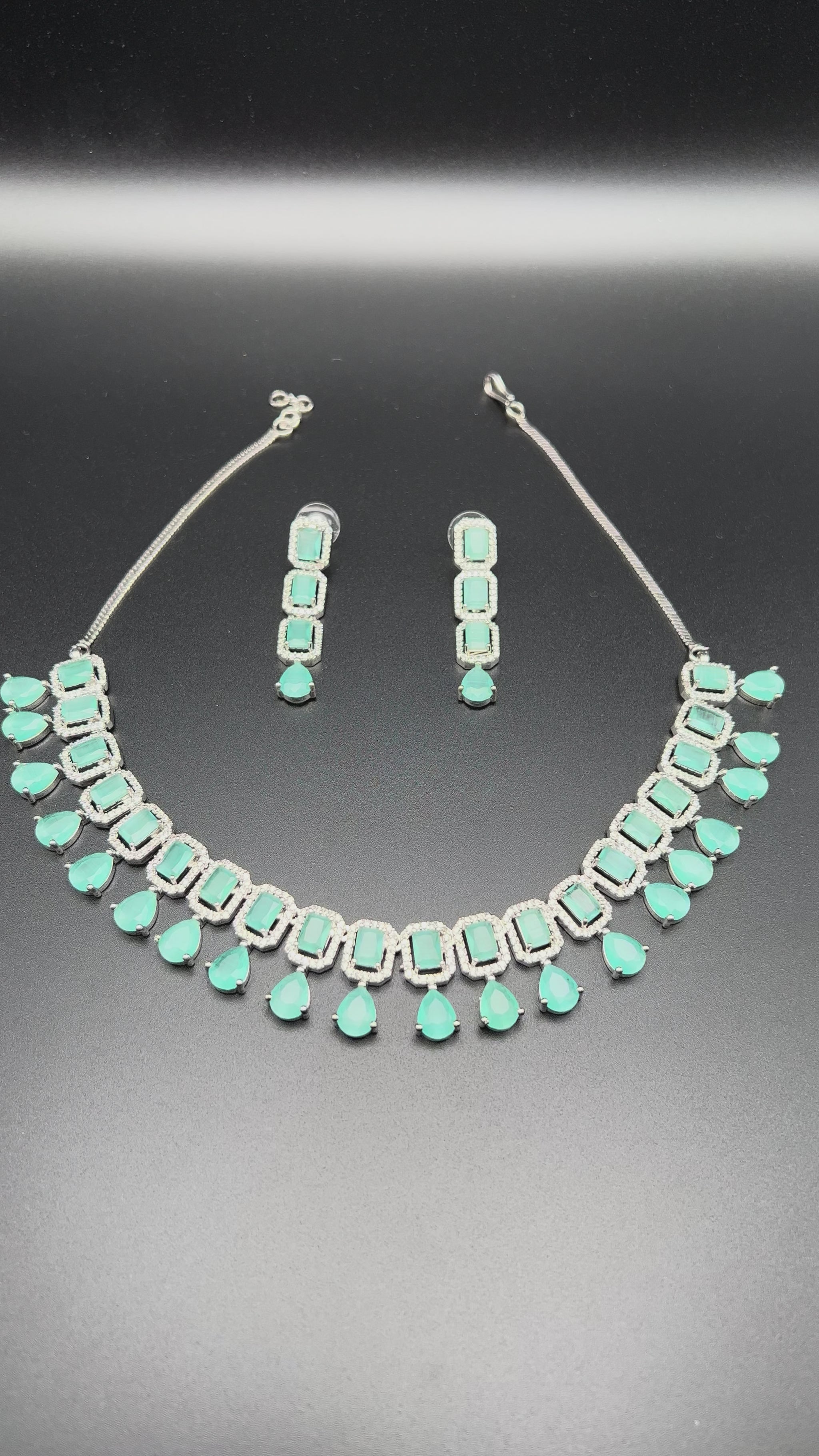 This exquisite American Diamond set features radiant, emerald-green stones framed in shimmering AD halos. The necklace is designed with rectangular stones along the base, each accented with dainty teardrop green drops for a graceful, cascading effect. Paired with matching linear earrings showcasing coordinated emerald-cut stones and a delicate drop, the set exudes refined elegance. Crafted with an anti-tarnish, rhodium-plated finish, it offers long-lasting shine and a premium, contemporary look—perfect for weddings, evening occasions, or festive celebrations.