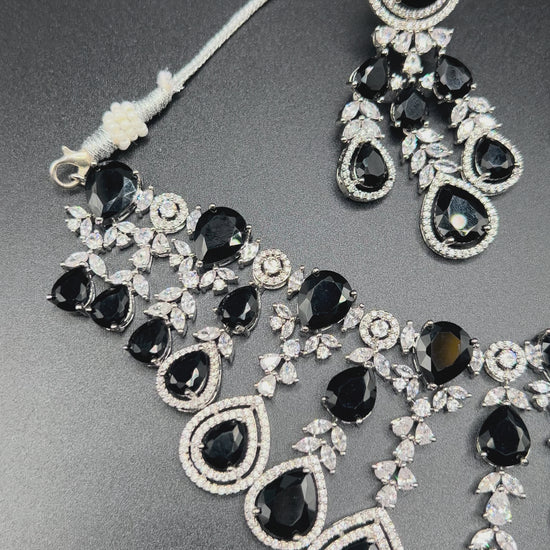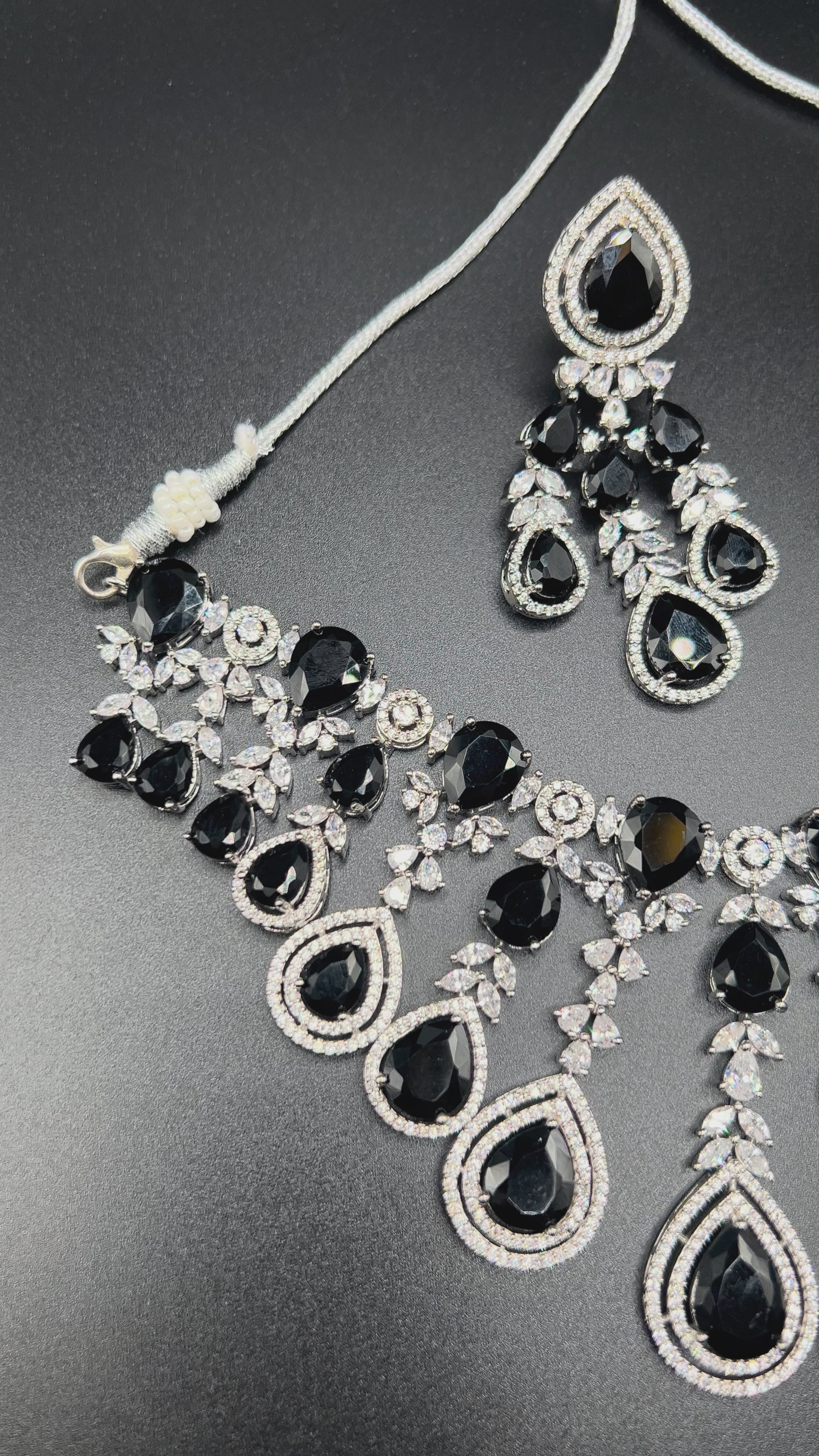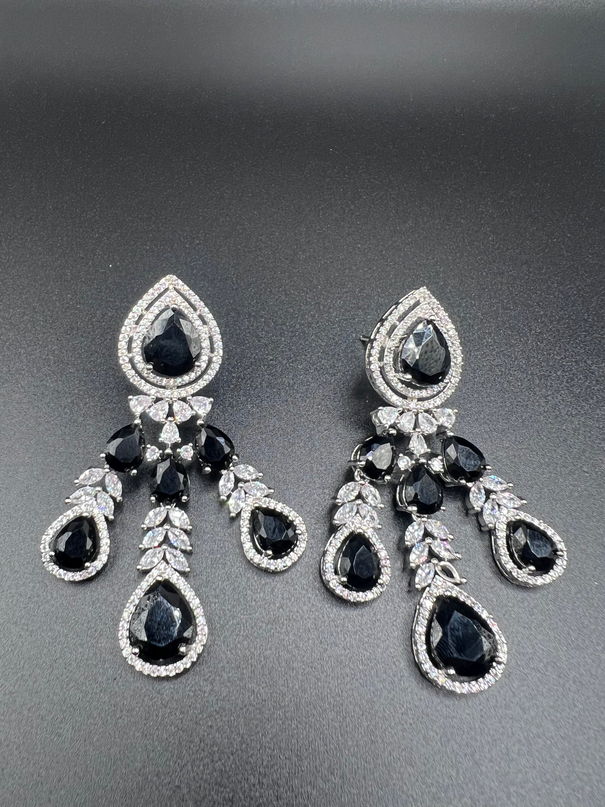 The rich contrast of the black synthetic stones against shimmering white CZ accents creates a regal, high-end look—ideal for brides, receptions, and special occasions. Set in a polished silver-tone finish, the intricate teardrop design captures both modern glamour and classic charm.